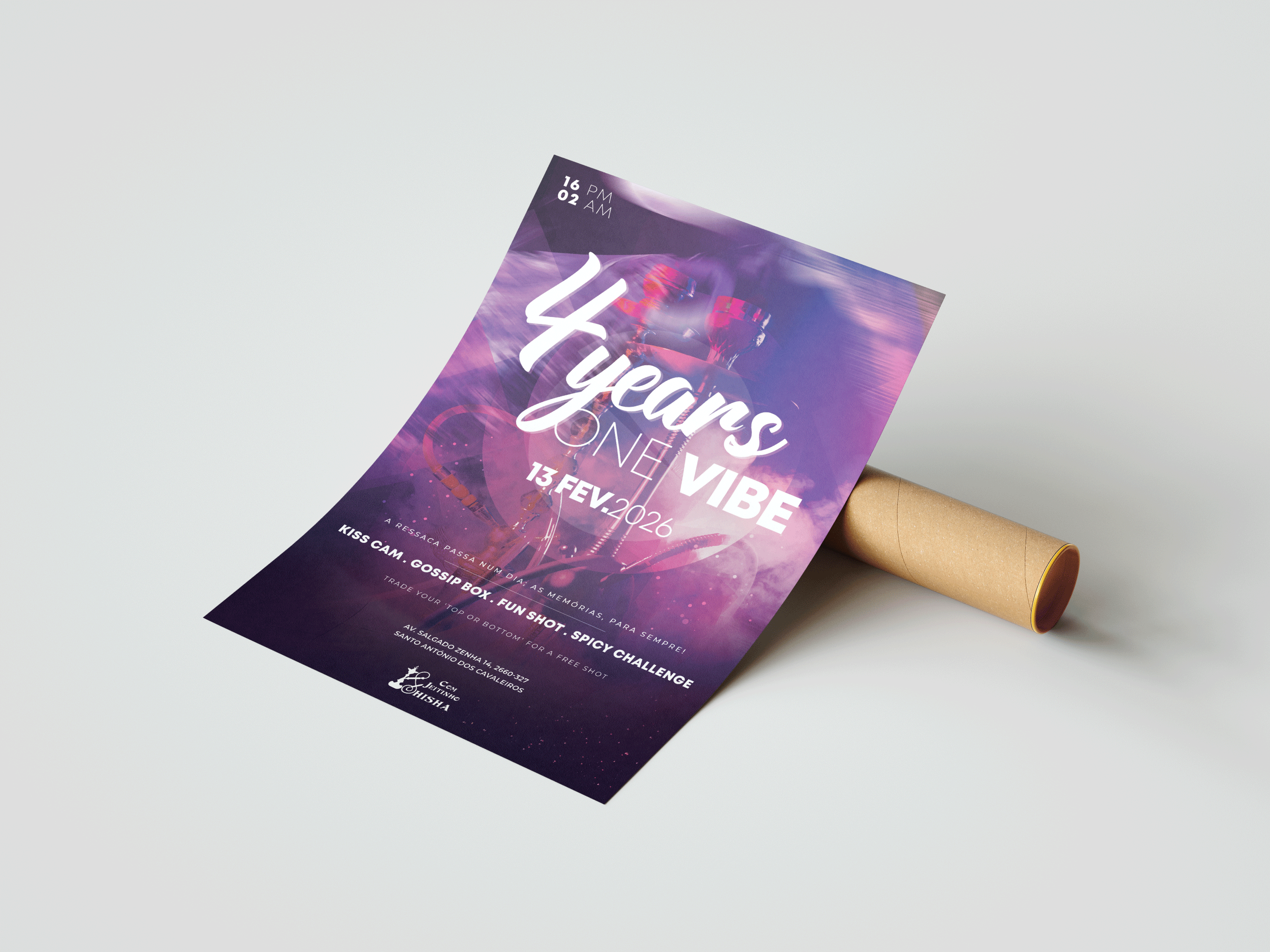 Criação da comunicação para o evento "4 Years, One Vibe" do bar Com Jeitinho Shisha. Através de uma estética moderna e energética, o design traduz a experiência sensorial do bar, destacando as ativações da noite sob uma atmosfera de luzes néon. O objetivo foi criar uma peça visualmente apelativa que reforçasse a ligação da marca com o seu público durante esta celebração especial.